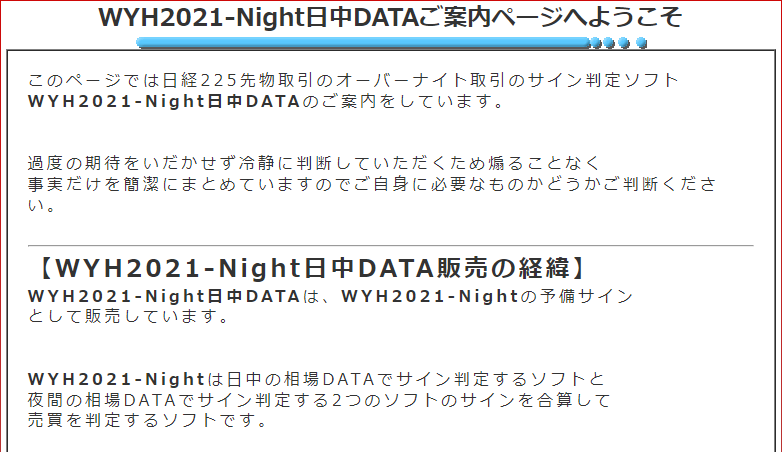 WYH2021-Night日中DATAは、日経225先物取引のオーバーナイト取引のサイン判定ソフトです。日経平均株価を予め定められた期日に、予め定められた価格で売買することを約束する取引のことを日経225先物取引といい、さらにこれを当日中にポジション決済をせず、翌日までポジションを持ち越すオーバーナイト取引で行うのが、日経225先物取引のオーバーナイト取引。このサイン判定ソフトになります。